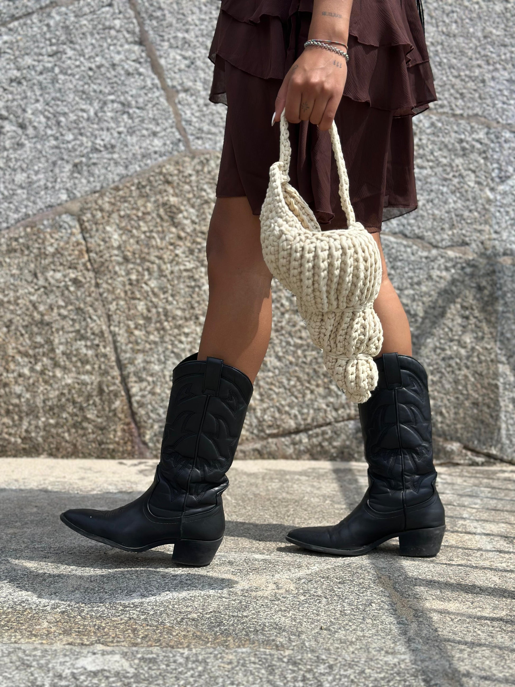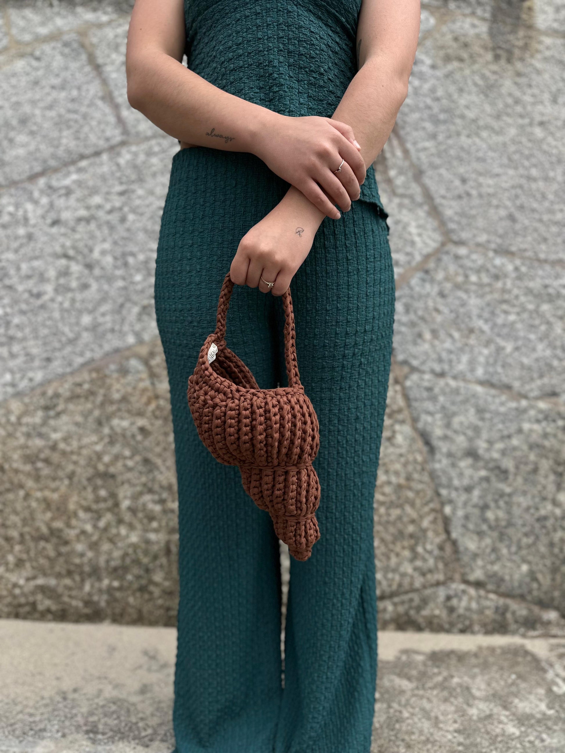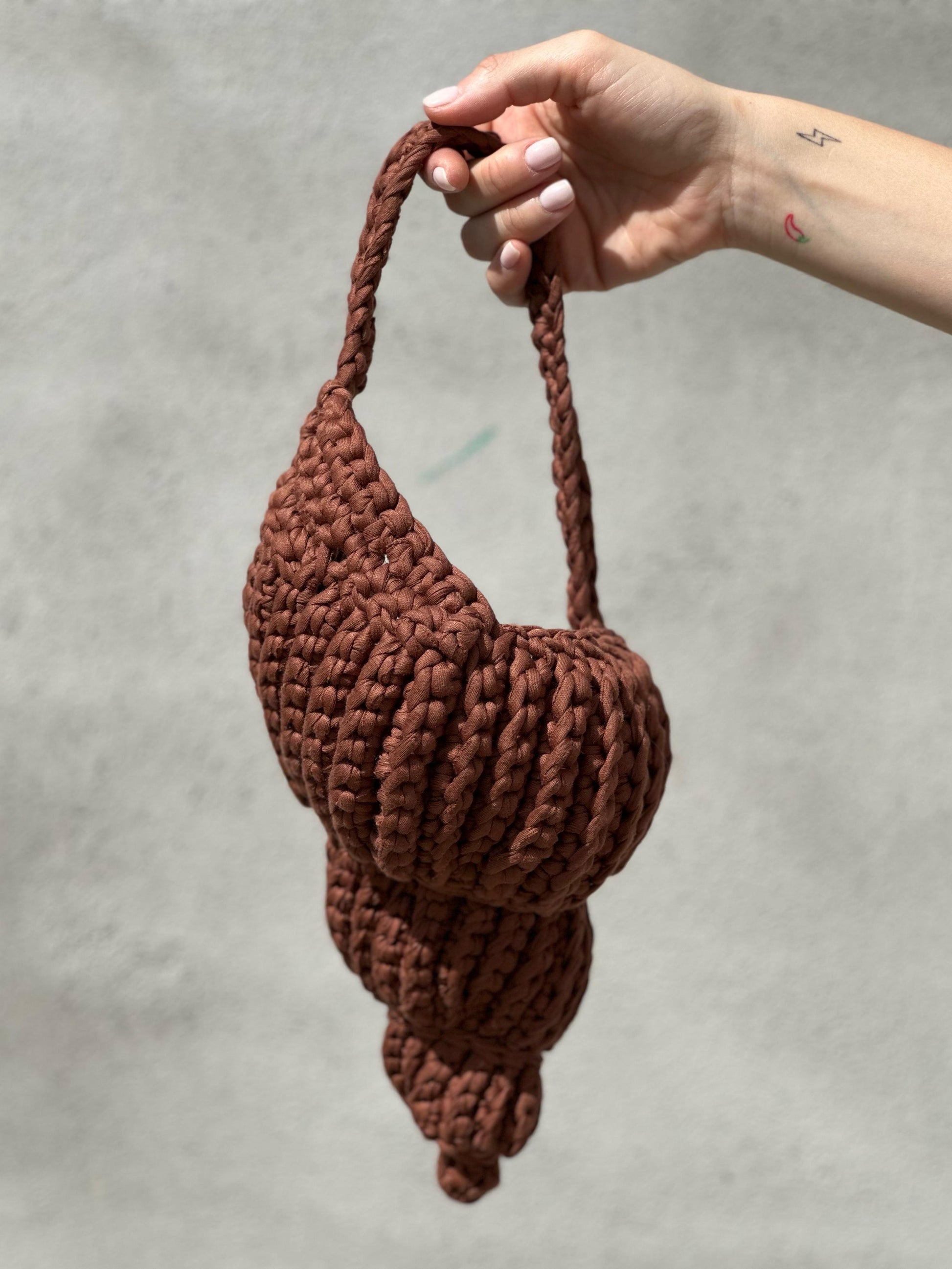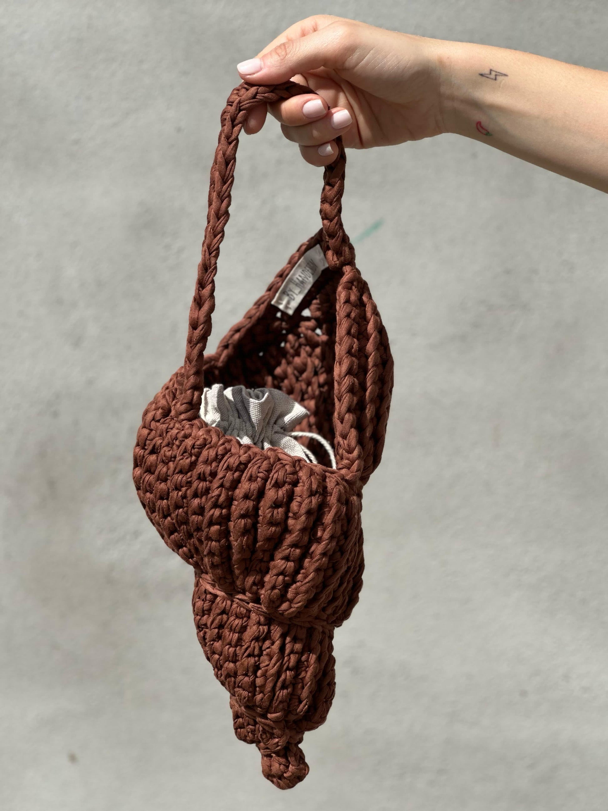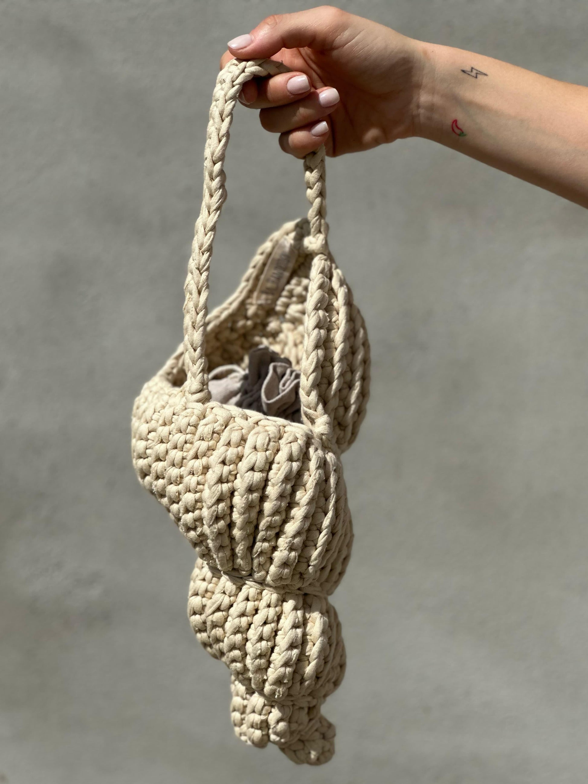 Bolso en forma de caracola hecho a mano con trapillo. Incluye bolsita interior