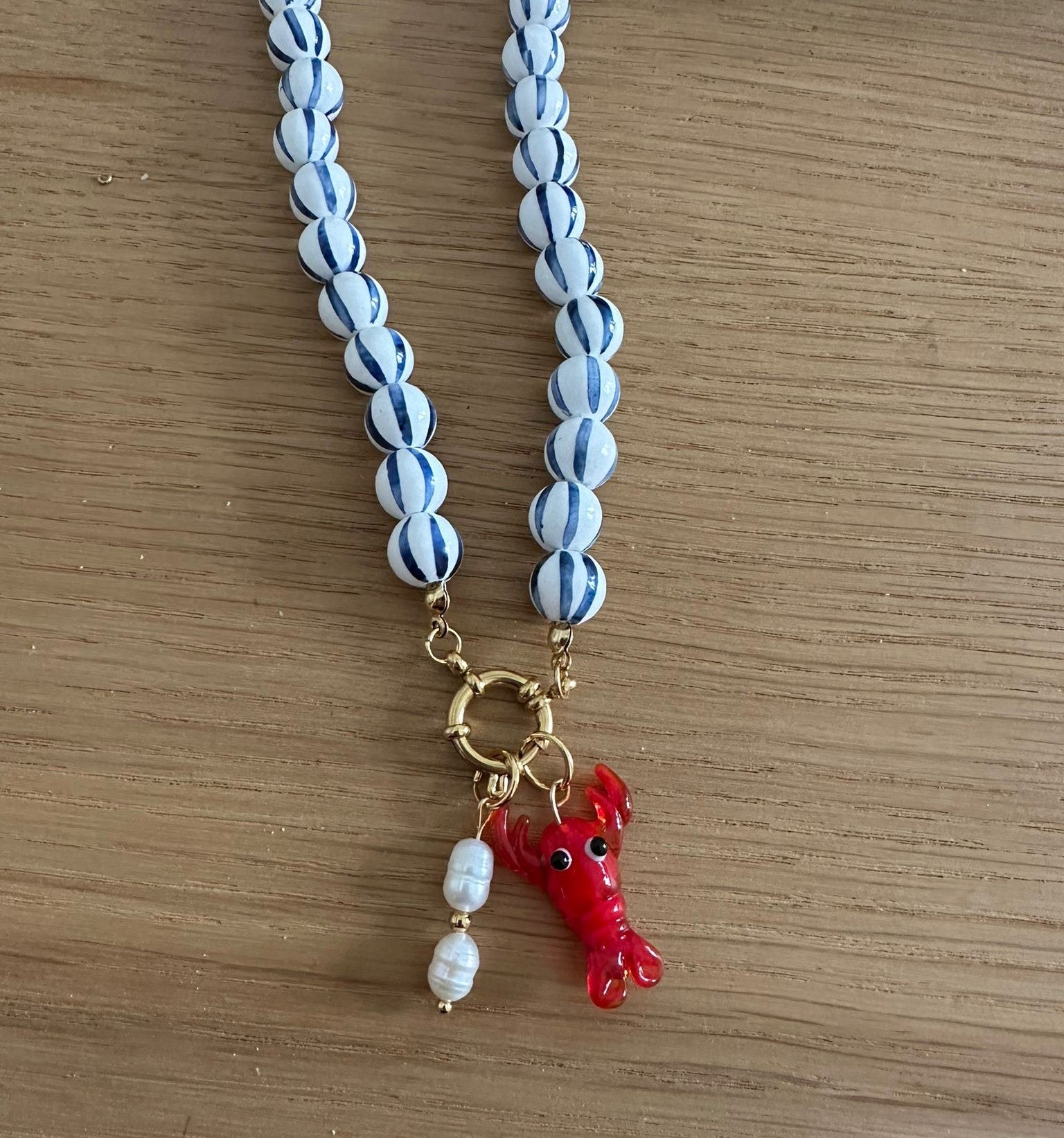 Collar con bolas cerámicas en color blanco y azul, timón en el delantero de acero inoxidable dorado con dos charms colgando: langosta hecha de cristal y perlas de río. Cierres en acero inoxidable
