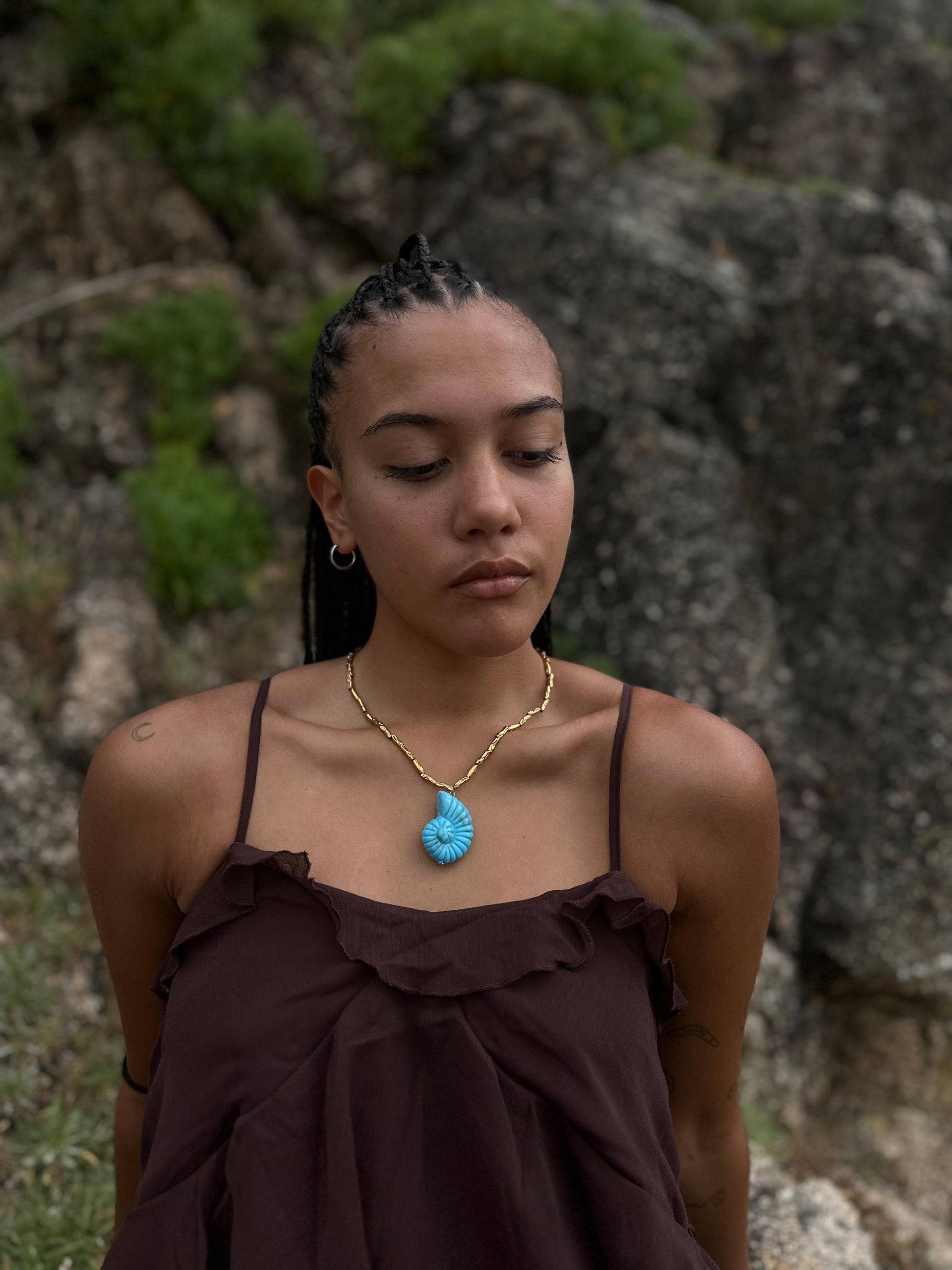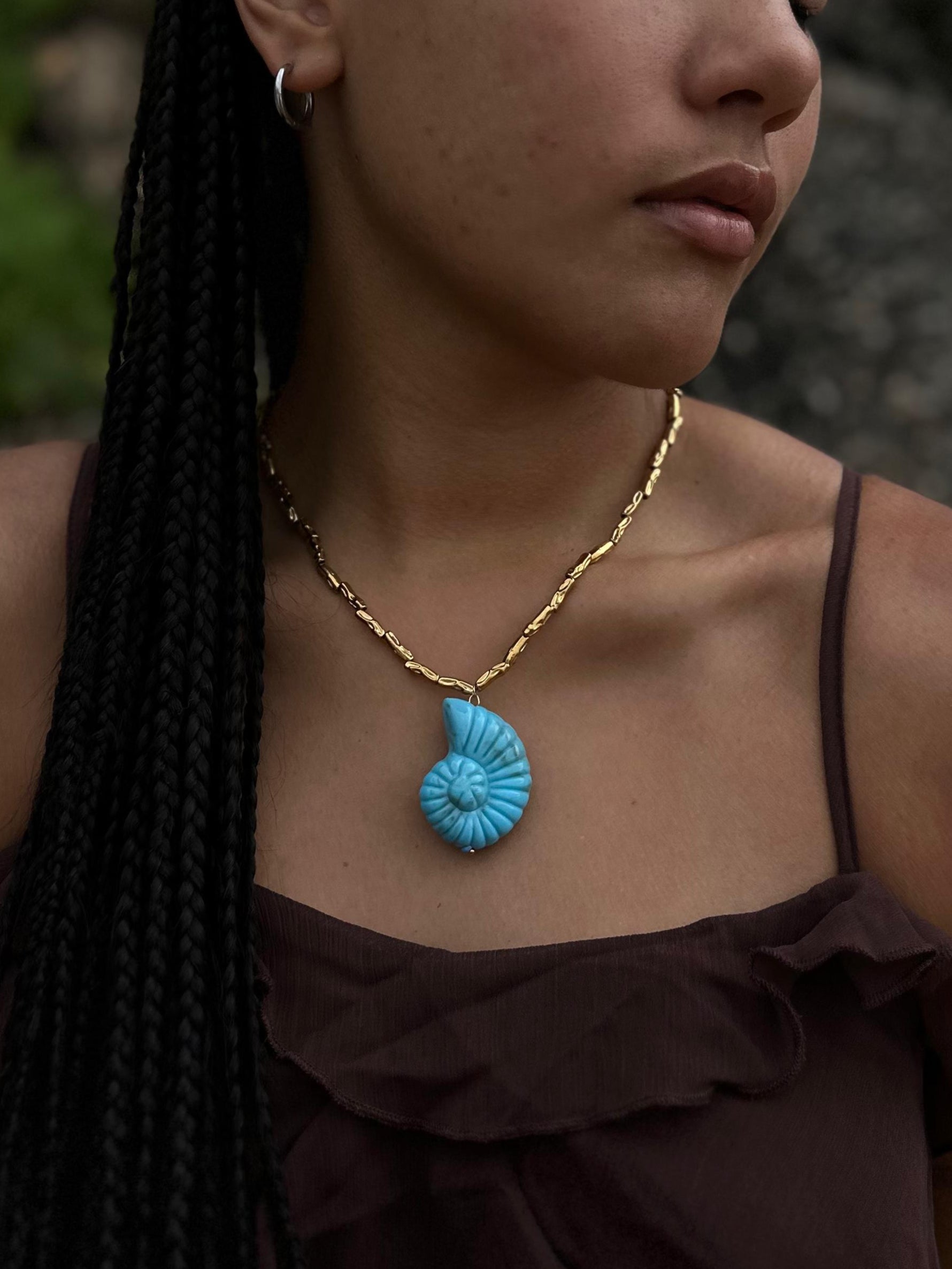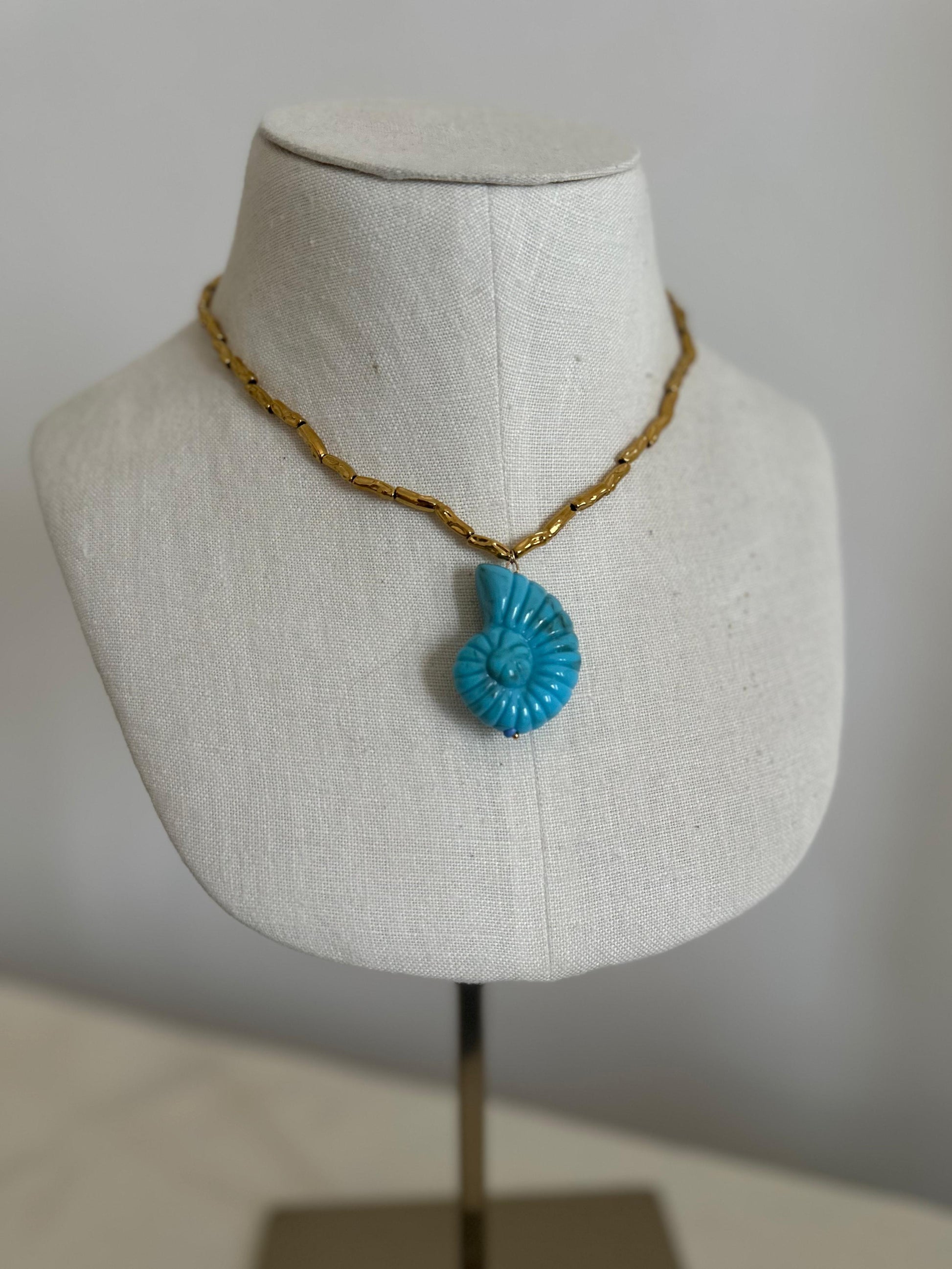 Collar hecho con macarrones dorados en acero inoxidable y caracol grande azul