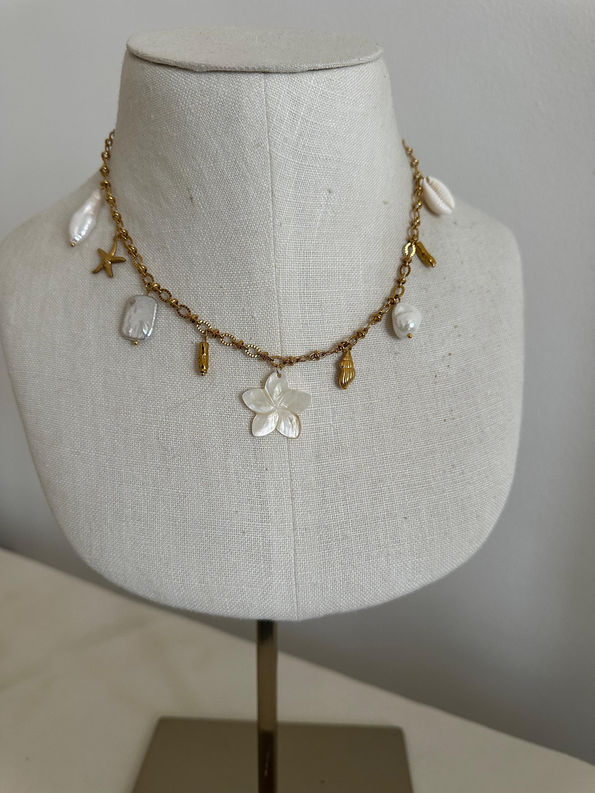 Collar multi charms con cadena y detalles en acero inoxidable, perlas y flor de nácar