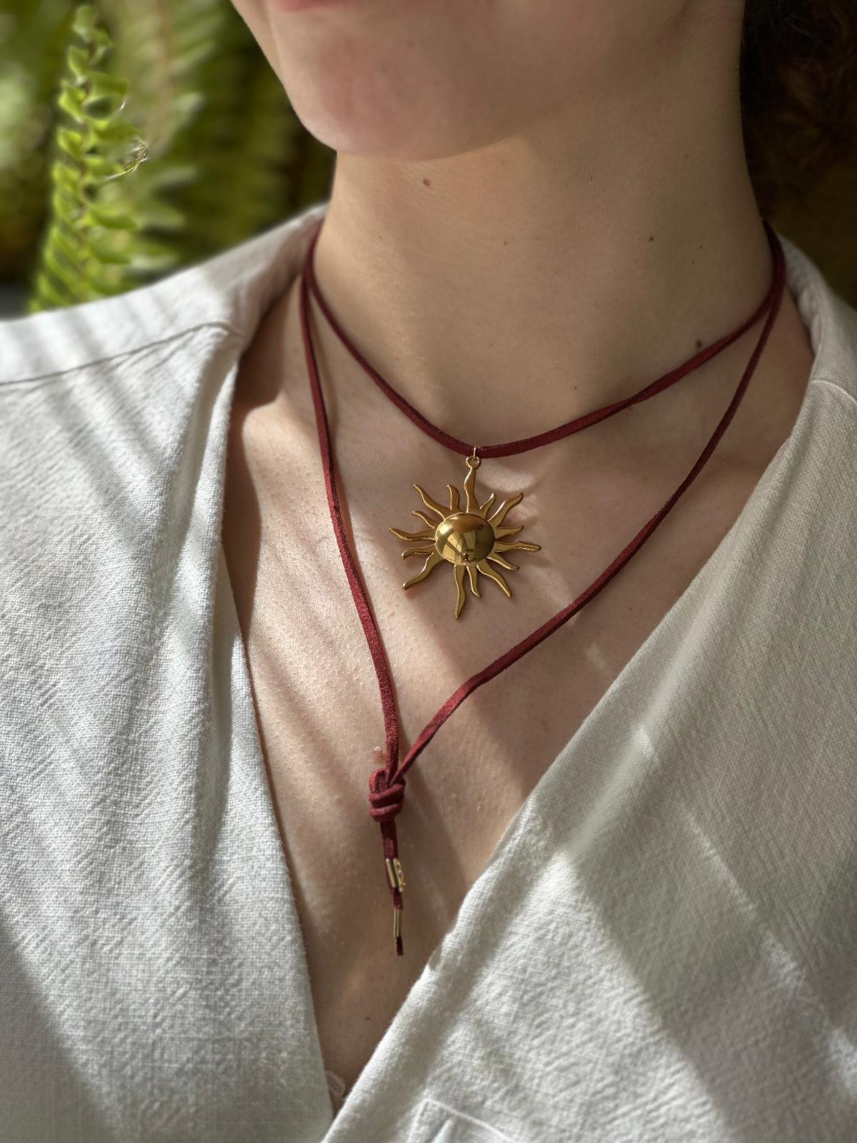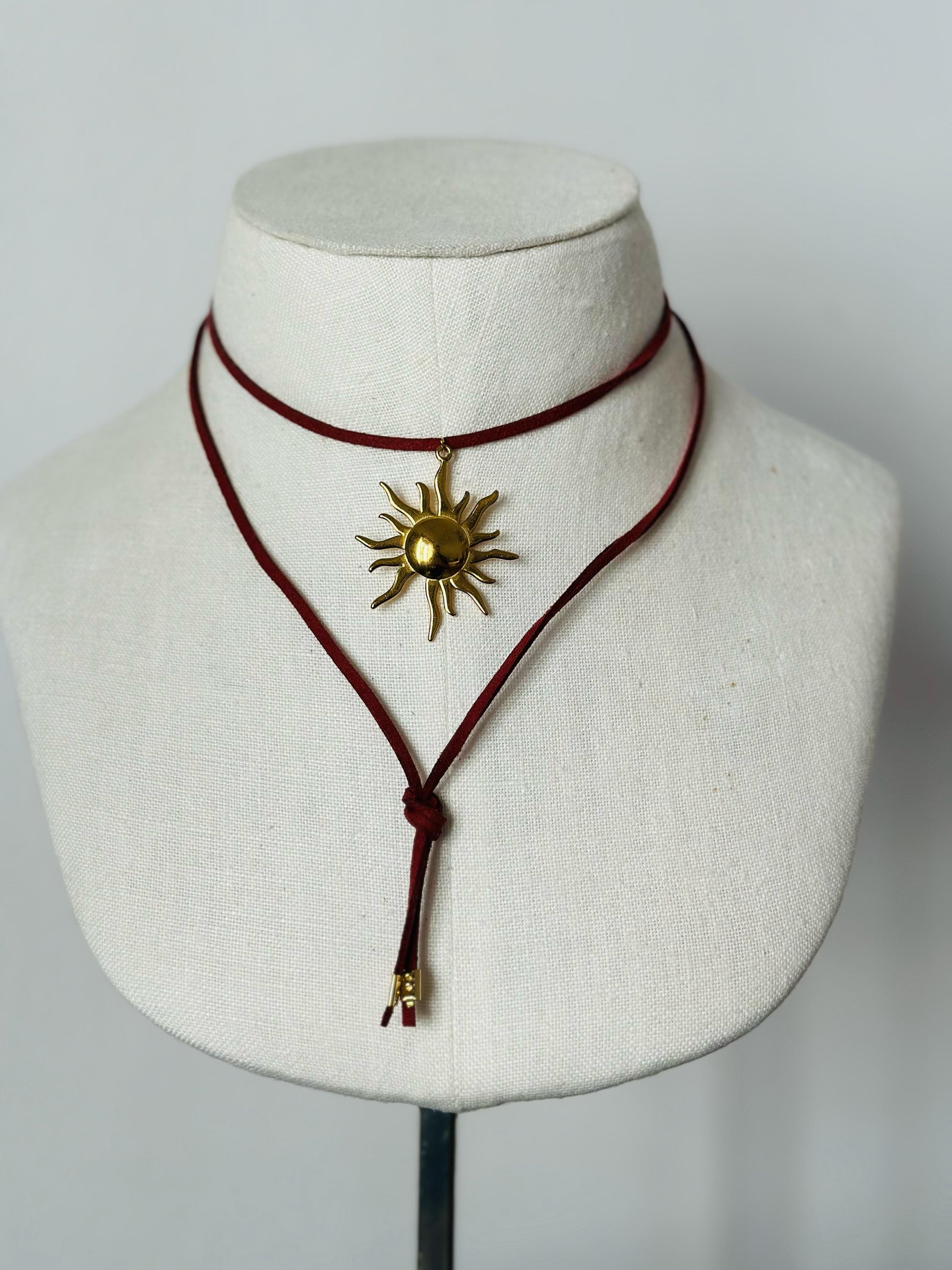 Collar estilo texas con sol de acero inoxidable dorado con cinta de antes en color granate